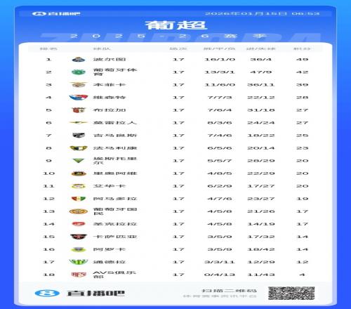 目前在联赛中,本菲卡17轮过后积39分排名葡超第3,虽然他们17轮过后11胜6平保持不败,但已经落后榜首波尔图10分。